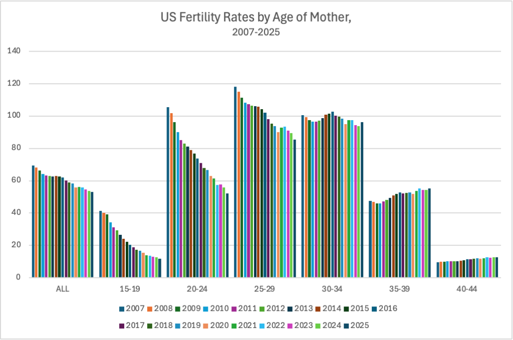 US fertility rates continued to fall overall in 2025 (down 1.3% for a total decline of 23.4% since 2007), including continued declines among women 15 through 29: rates for teens15-19 were down 7.1% between 2024 and 2025 to 11.7 births per thousand women in that age group (down 72% since 2007), rates were down6.5% among women 20-24 to 52.2 births (down 50.5% since 2007), and down 4.4% among those 25-29 to 85.6 births (down 27.5% since 2007).